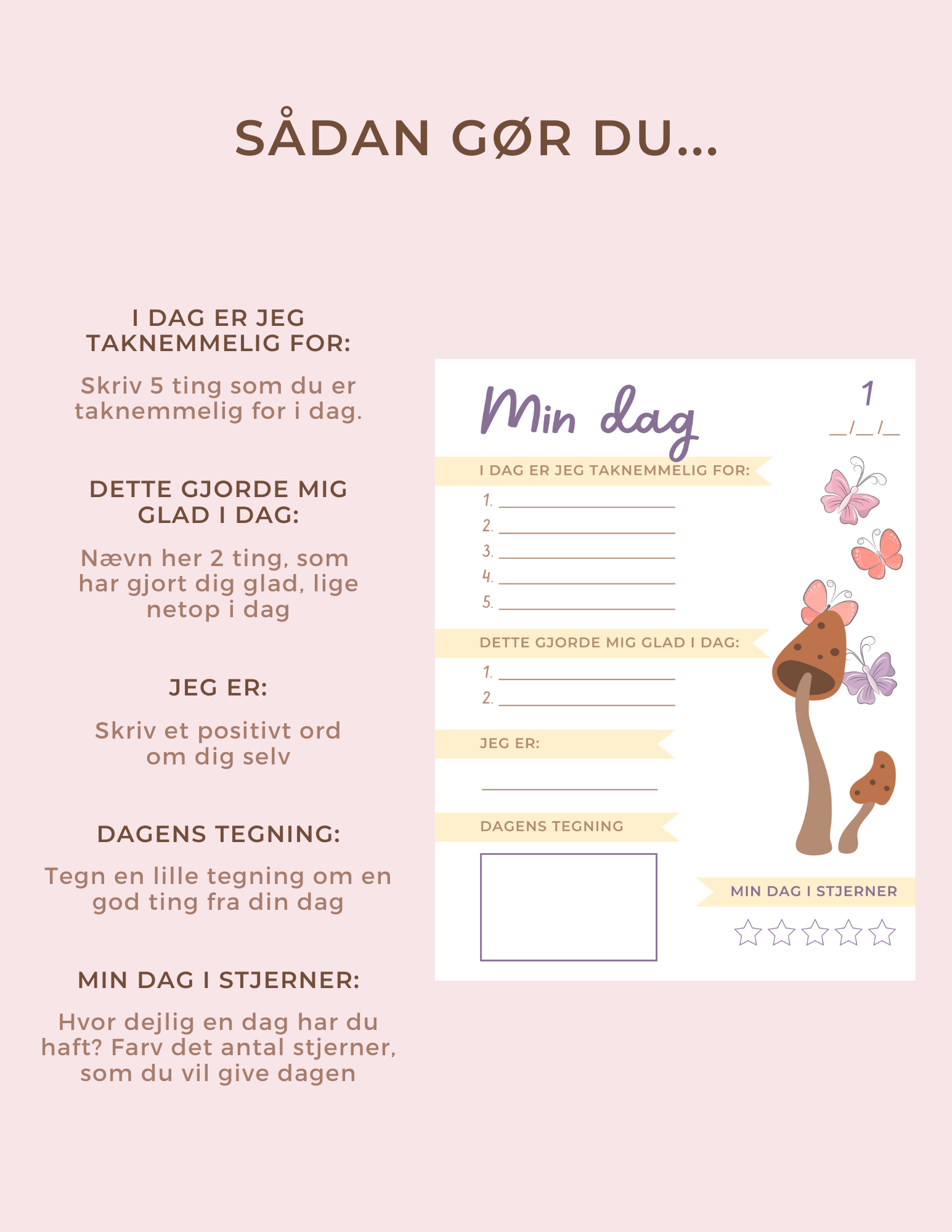 Der er i alt sider til 90 dage, hvorpå der kan nedskrives taknemmelighed på forskellige områder. Siderne er fortrykt med spørgsmål, som gør det lettere at få skrevet deri på daglig basis.